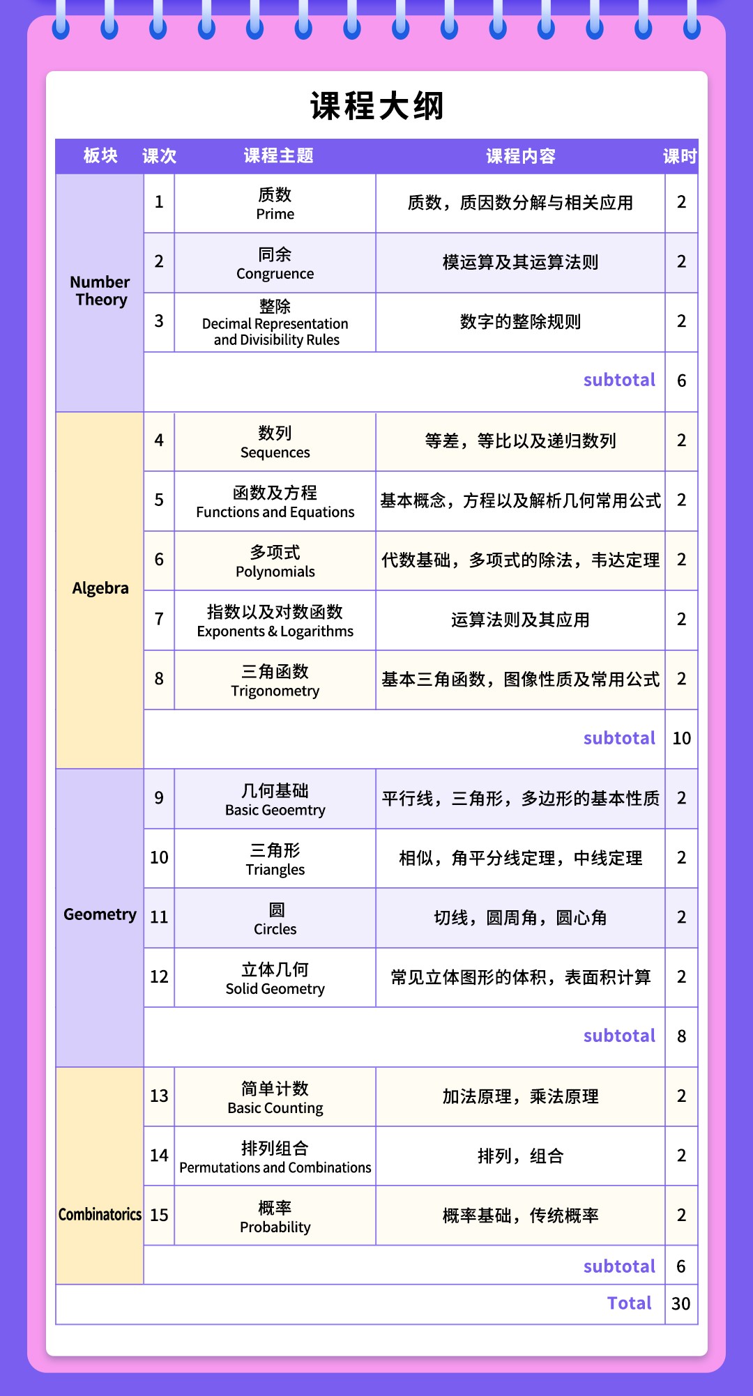 | 班型 | 人数 | 课时 | 开课时间 |