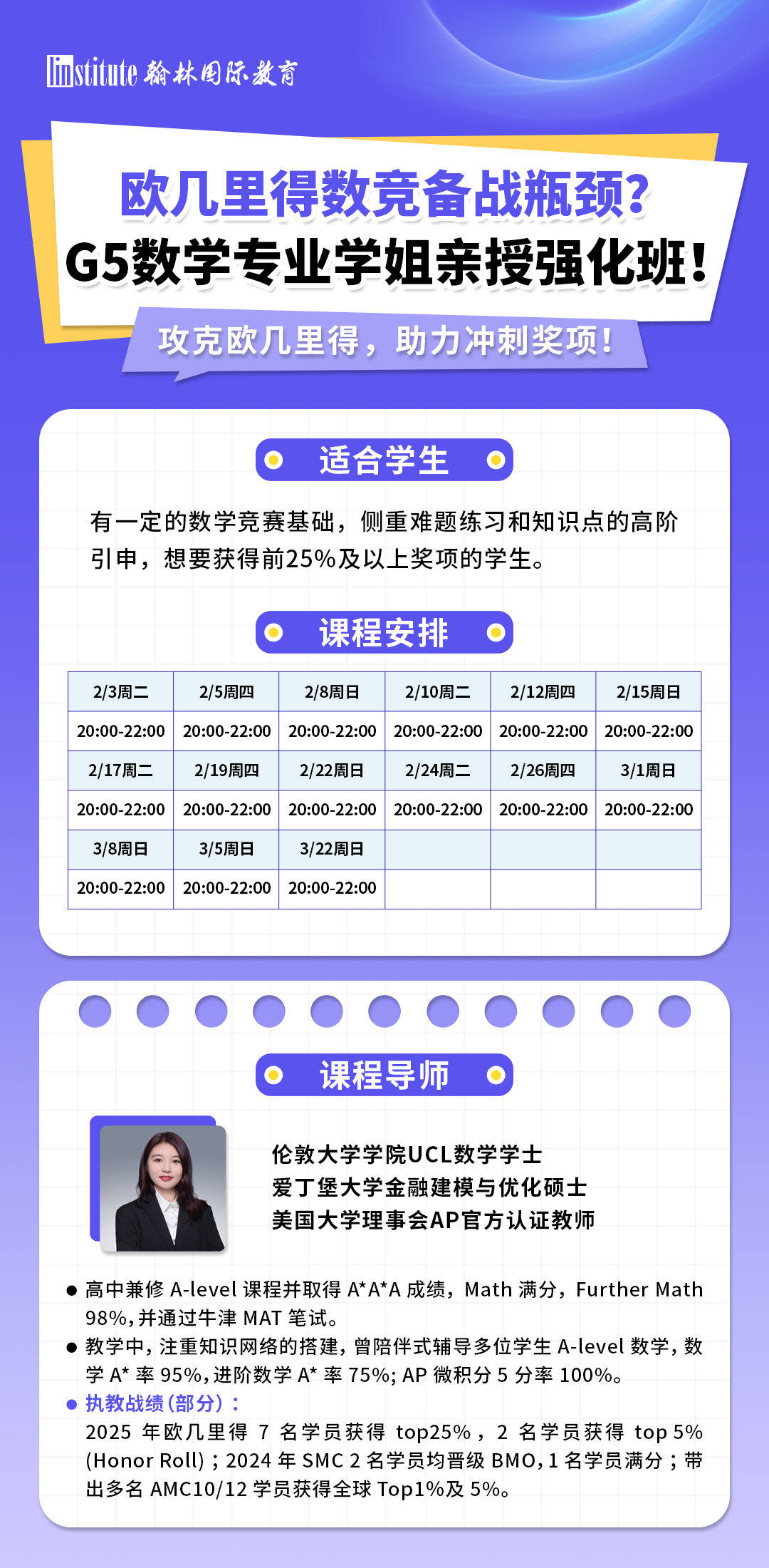 我们的欧几里得辅导课程配有独家自研教材,授课老师均为海内外名校毕业,具有丰富的竞赛教学经验,并根据不同基础学生开设了不同的班课,真正做到有的放矢,事半功倍!